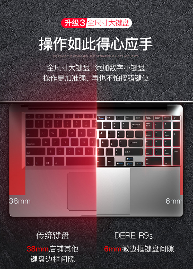 • 产品名称:戴睿(dere) R9s 15.6英寸超轻薄窄边框笔记本电脑 全新四核便携手提学生商务办公游戏上网本 枚红色 6G内存 128G固态