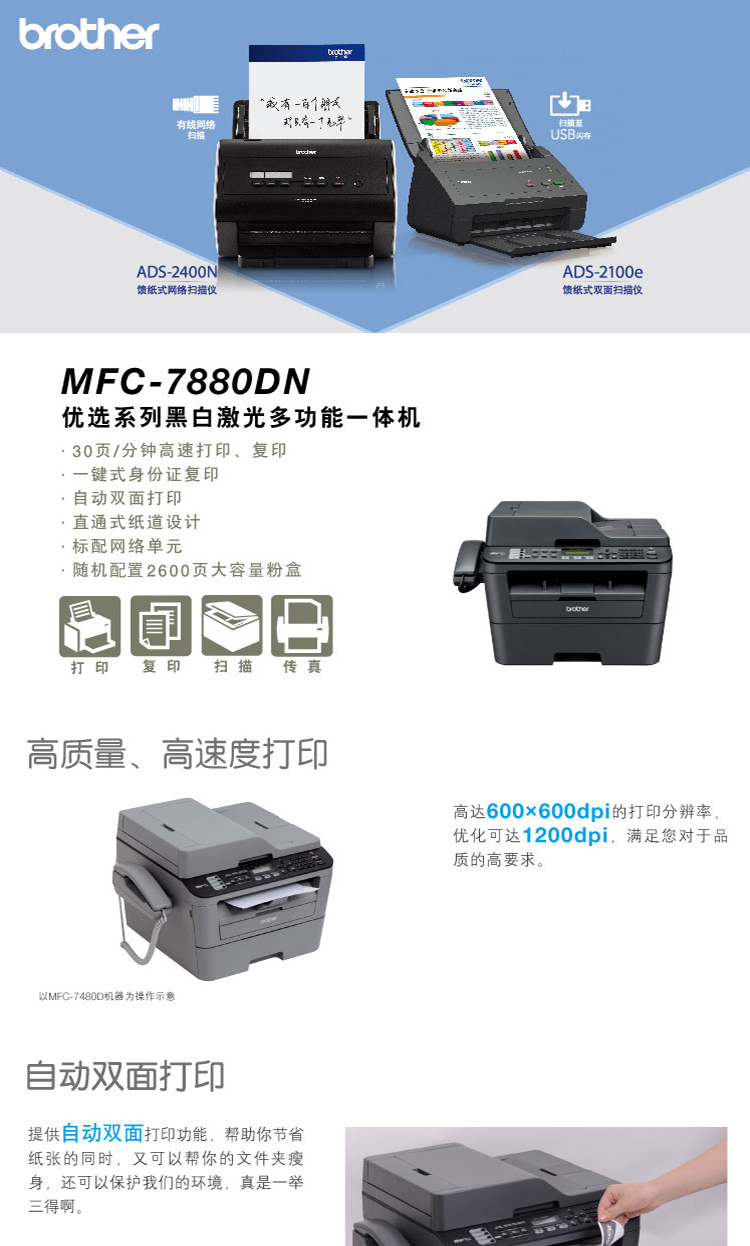 • 产品名称:兄弟(broTher) A4黑白激光多功能一体机 MFC-7880DN 复印 打印 传真 扫描 四合一