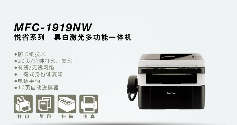 • 产品名称:兄弟(brother) MFC-1919NW 黑白激光多功能一体机 打印/复印/扫描/传真 有线/无线网络打印